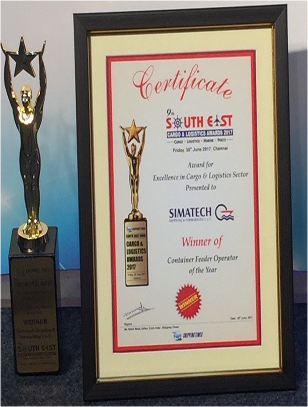 Simatech has been awarded winner of “CONTAINER FEEDER OPERATOR OF THE YEAR” at the 9th South East Cargo and Logistics Award 2017 on the 30th June at Chennai. This is the second consecutive year Simatech has been awarded at South East Cargo and Logistics, Chennai.