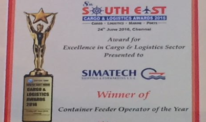 Simatech Shipping is awarded the “Container Feeder Operator of the Year Award” at the 8th South East Cargo & Logistics Award Ceremony 2016 held in Chennai, India on June 24th, 2016. Simatech is the leading container feeder operator in India operating eleven weekly services to / from India.